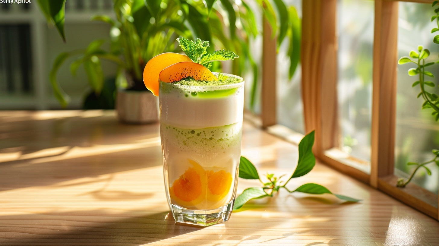 ご自宅でも楽しめるフルーツ抹茶ラテのイメージです。